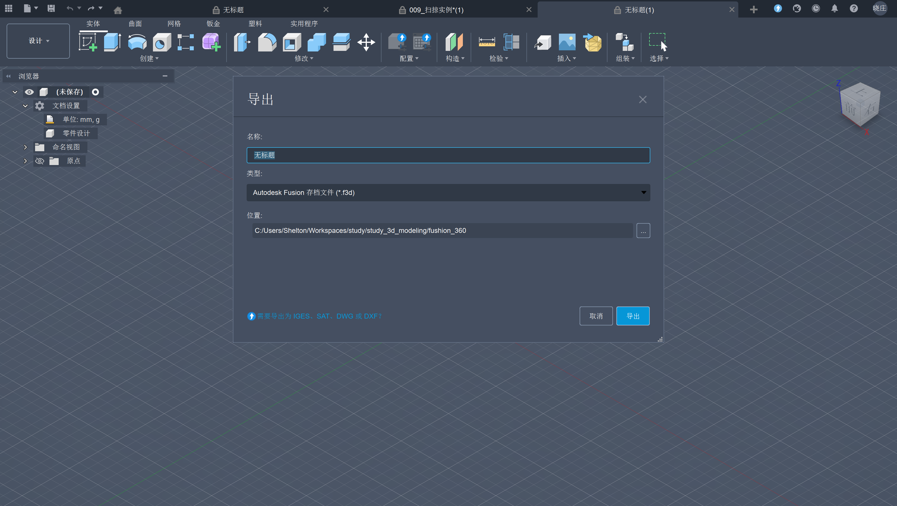 由于fusion360是在线存储的,所以保存本地的话需要使用导出f3d格式,打开的时候选择导入