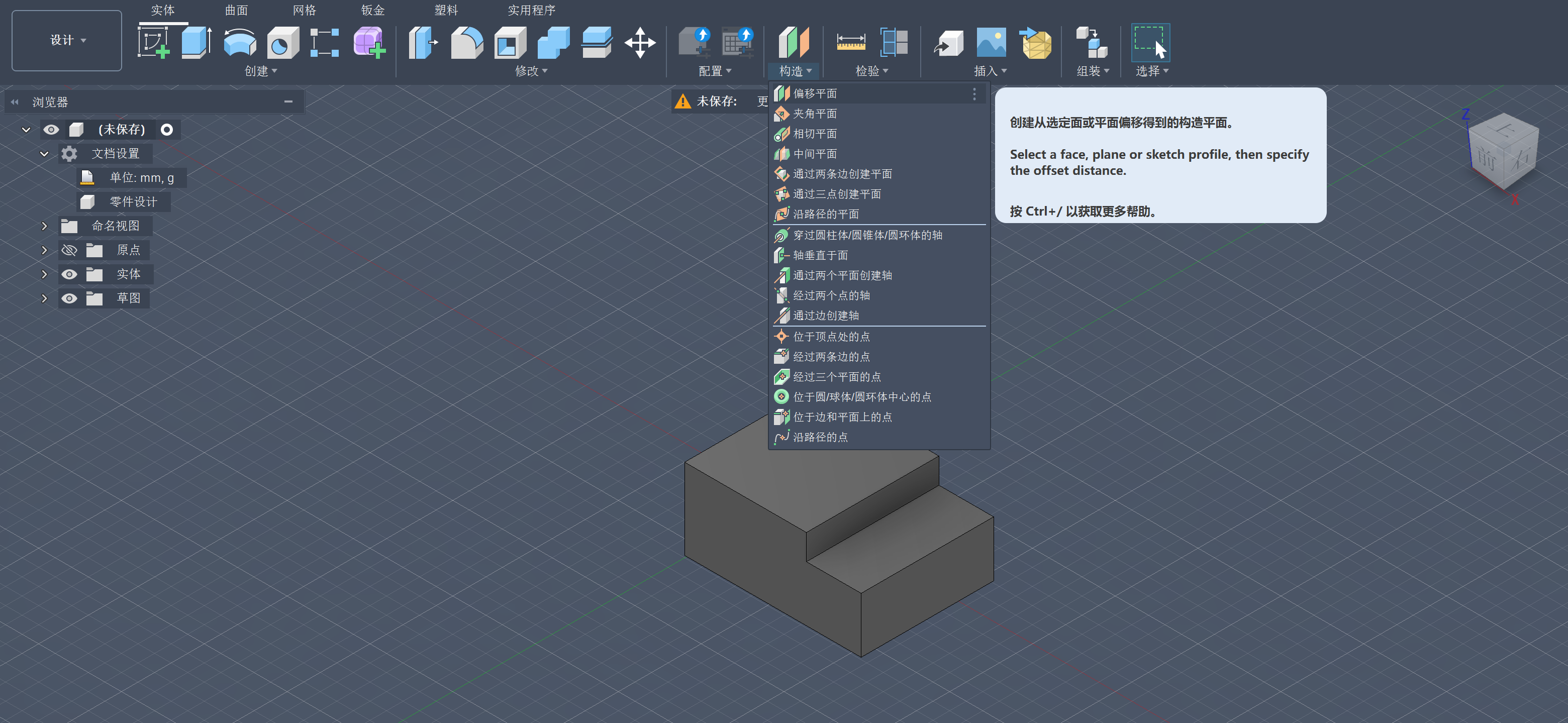 可以创建xyz以外的一个基础平面,用于绘制草图,比如两个平面的中间点平面